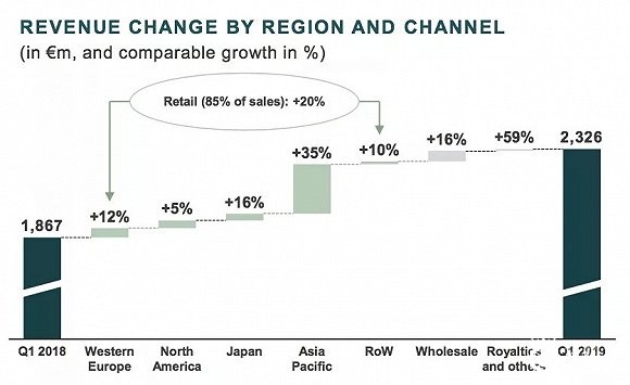 爱马仕集团2019年一季度销售额各大区增幅