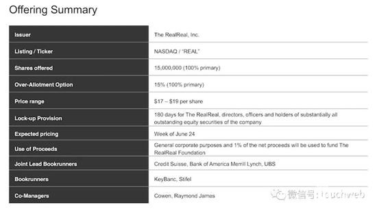 The RealReal的发行区间为17到19美元,发行1500万股,募集资金最高近3亿美元,The RealReal预计在6月24日确定发行价,此后在纳斯达克上市。