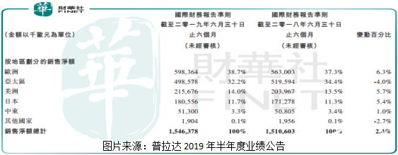 拆分开来看,普拉达的收入来源于全世界,其中欧洲、亚太区、美洲和日本收入来源占总收入95%以上。2019年上半年公司来自亚太区收入出现了4.0%的下滑,剩下其他占比营收较大的地区,收入都是保持增长的,对于亚太区收入下滑原因,公司在半年报中解释说,主要是因为中国社会动荡及不利的货币波动影响,香港经济收缩所导致。