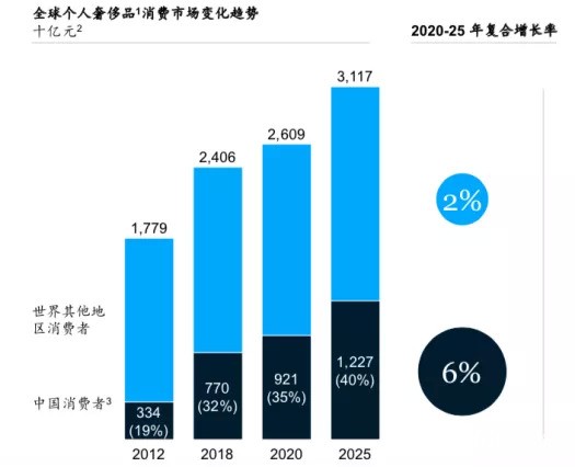根据麦肯锡发布的《中国奢侈品报告2019》,去年 1 年,中国消费者在境内外的奢侈品消费额达到 7700 亿元人民币,占到全球奢侈品消费总额的三分之一。到 2025 年,奢侈品消费总额有望增至 1.2 万亿元人民币。而在 2012 年至 2018 年间,全球奢侈品市场超过一半的增幅来自于中国。这个比例预计至 2025 年将达到 65%。