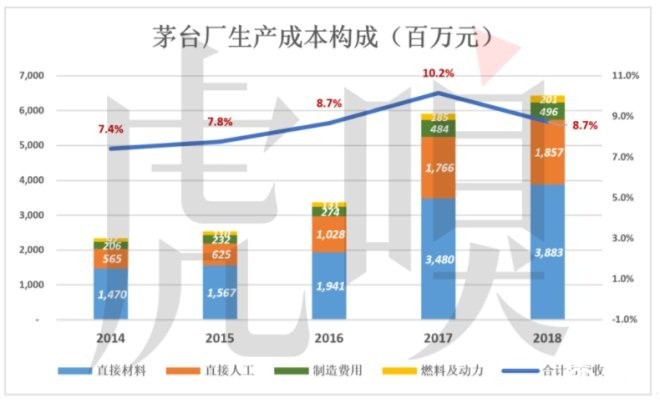 2018年,茅台总生产成本占营收的8.7%。如果分别计算,茅台酒和系列酒毛利润率分别为94%和71%。
