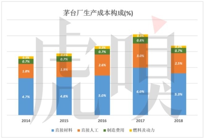 茅台厂生产成本主要包括直接材料(含包装材料)、直接人工、制造费用、燃料与动力等四大类。茅台没有分别披露茅台酒、系列酒的生产成本。