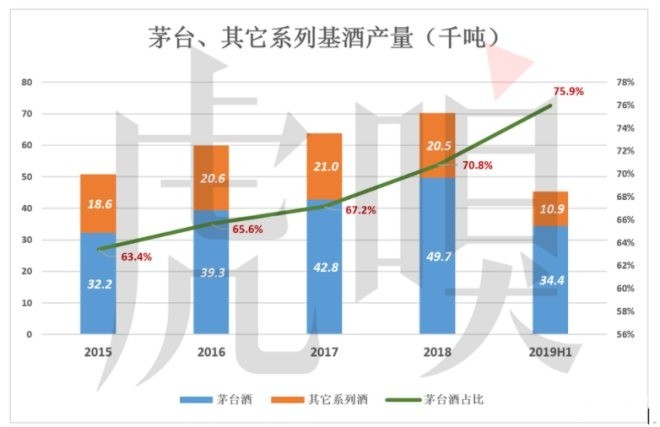 有意思的是,近年茅台酒基酒产量占比一直在提高。2015年茅台、系列酒基酒产量分别为3.22万吨和1.86万吨,茅台基酒产量占比64.3%;2019年H1,茅台、系列酒基酒产量分别为3.44万吨和1.09万吨,茅台基酒产量占比提高到75.9%。