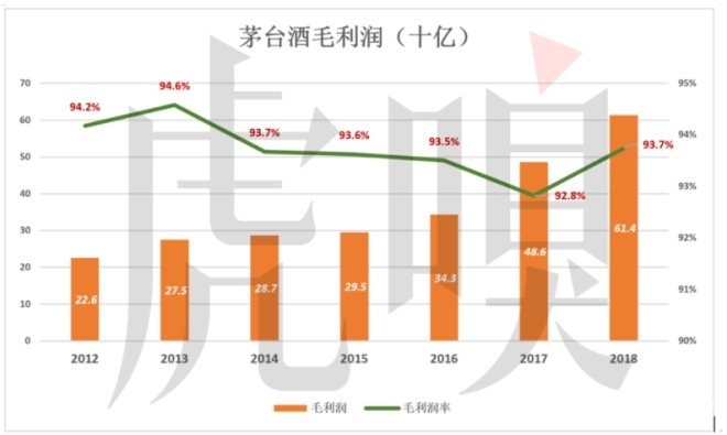 最近十年,茅台酒毛利润率从未低于90%。2018年茅台酒毛利润614亿,毛利润率93.7%。