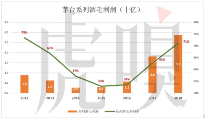 系列酒毛利润率经历2014年~2016年“低谷”后迅速回升,2018年系列酒毛利润57亿,毛利润率71%。