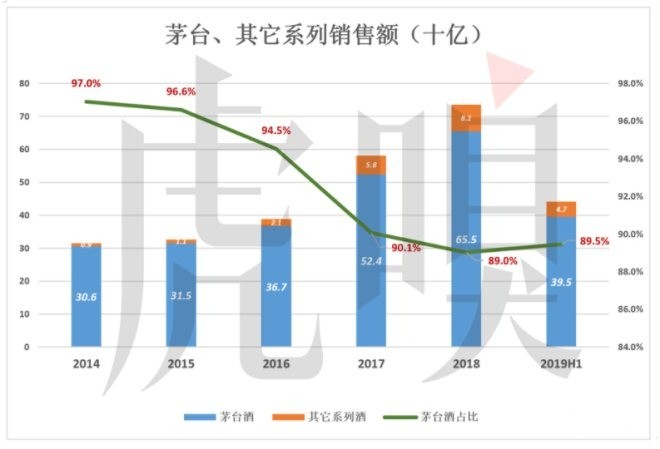 2018年茅台酒占比降到89%,其它系列酒达到11%。茅台欣然发出公关稿称“双轮驱动已经成形”。2019年H1,茅台酒销售额占比又回升到89.5%。