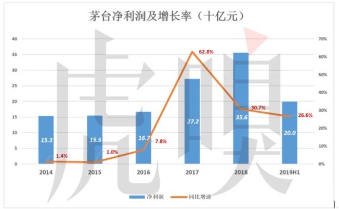 2016年茅台增速走出低谷,营收同比增长回到两位数,2017年更是猛增50%,但2018年回落到26%,2019年H1只有18%。