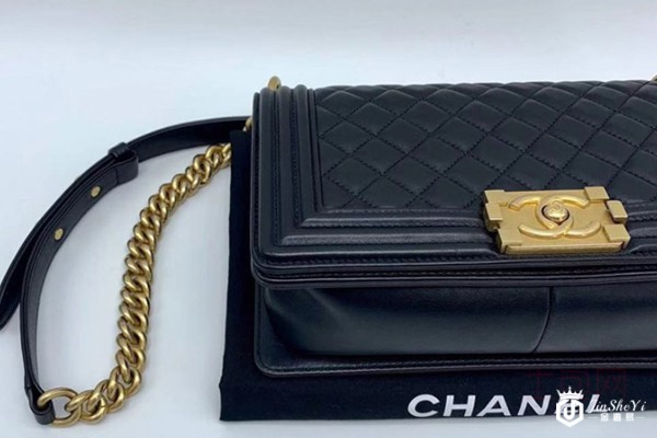 上图为香奈儿Leboy中号黑金羊皮复古银扣包包