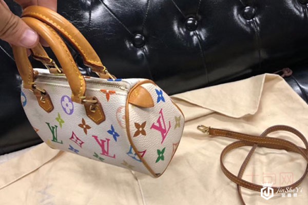 上图为99新附有防尘袋、肩带白三彩lv speedy nano包包侧面展示