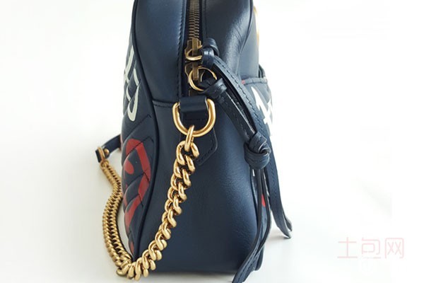 上图为古驰女士蓝色涂鸦款金属链条相机包443499侧面