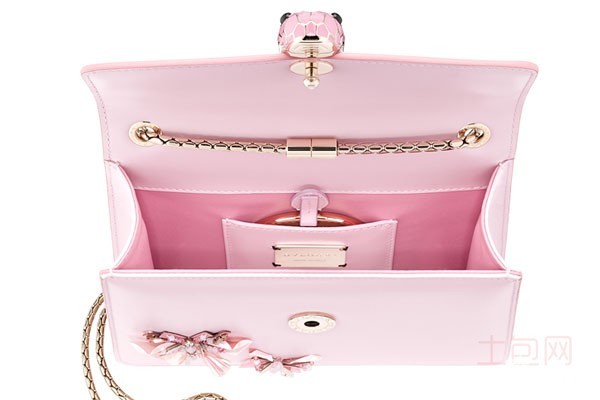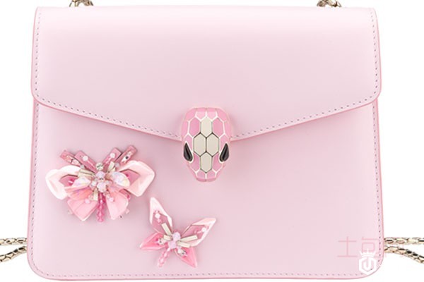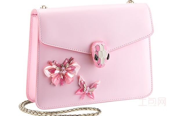 上图为宝格丽女士玫瑰色牛皮蝴蝶刺绣斜挎包