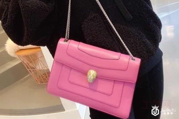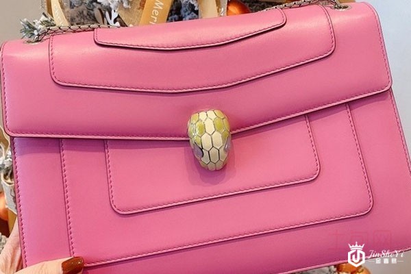 上图为宝格丽蛇头包中号银色双链条单肩包粉色