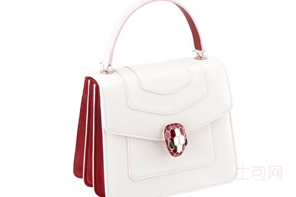 上图为宝格丽/BVLGARI 女士白玛瑙色包身两侧红宝石色小牛皮蛇头斜挎包