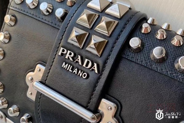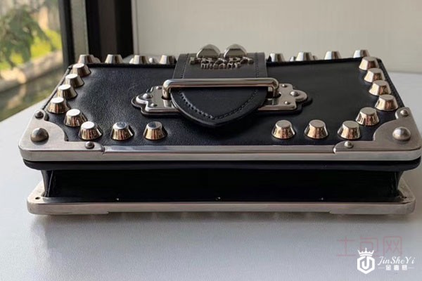上图为二手普拉达黑色小牛皮铆钉Cahier包包细节