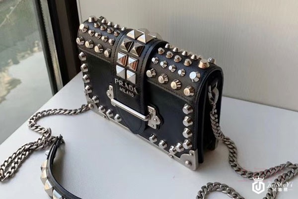 上图为二手普拉达黑色小牛皮铆钉Cahier包包