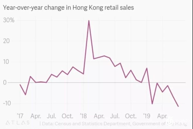 ▲图为香港近两年来的零售行业表现