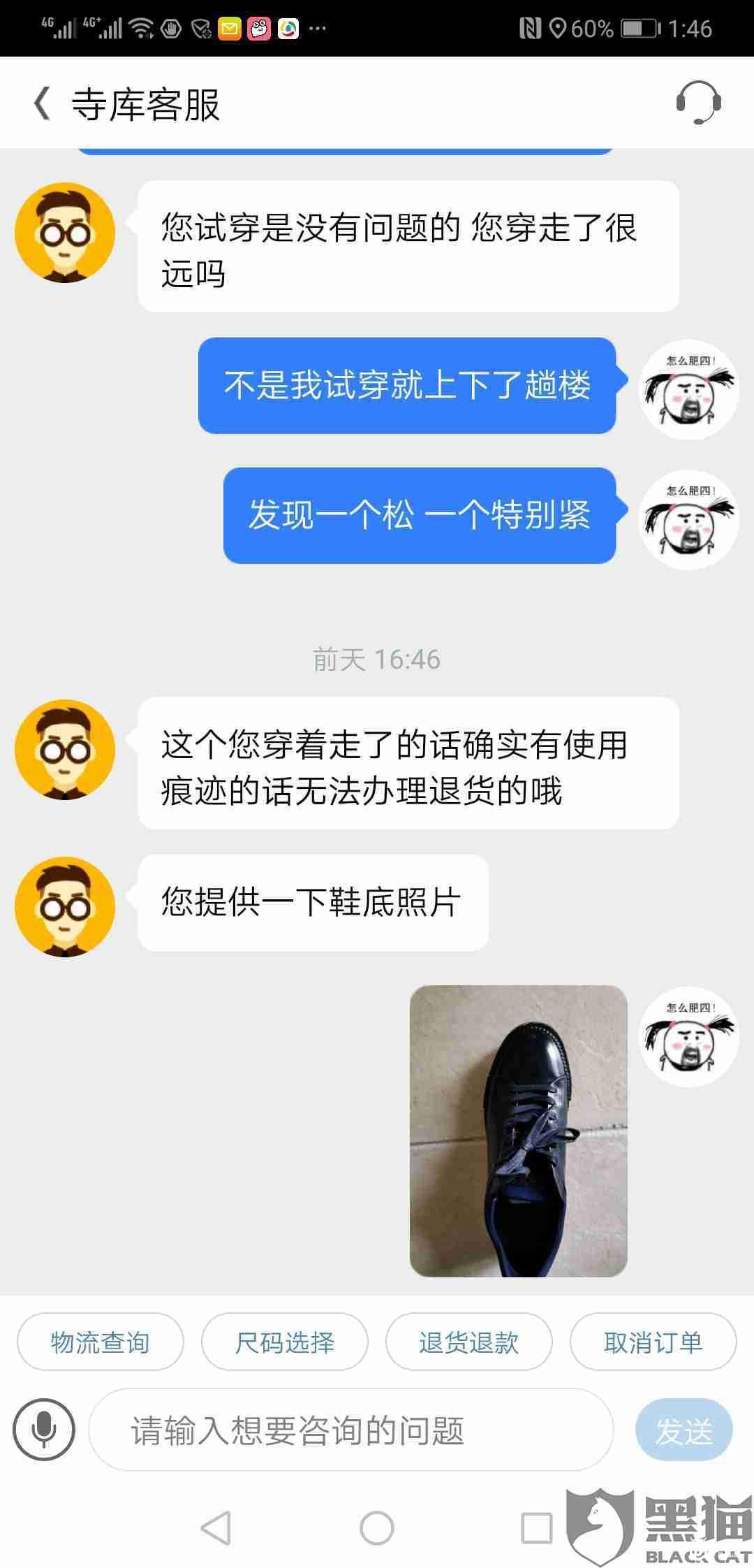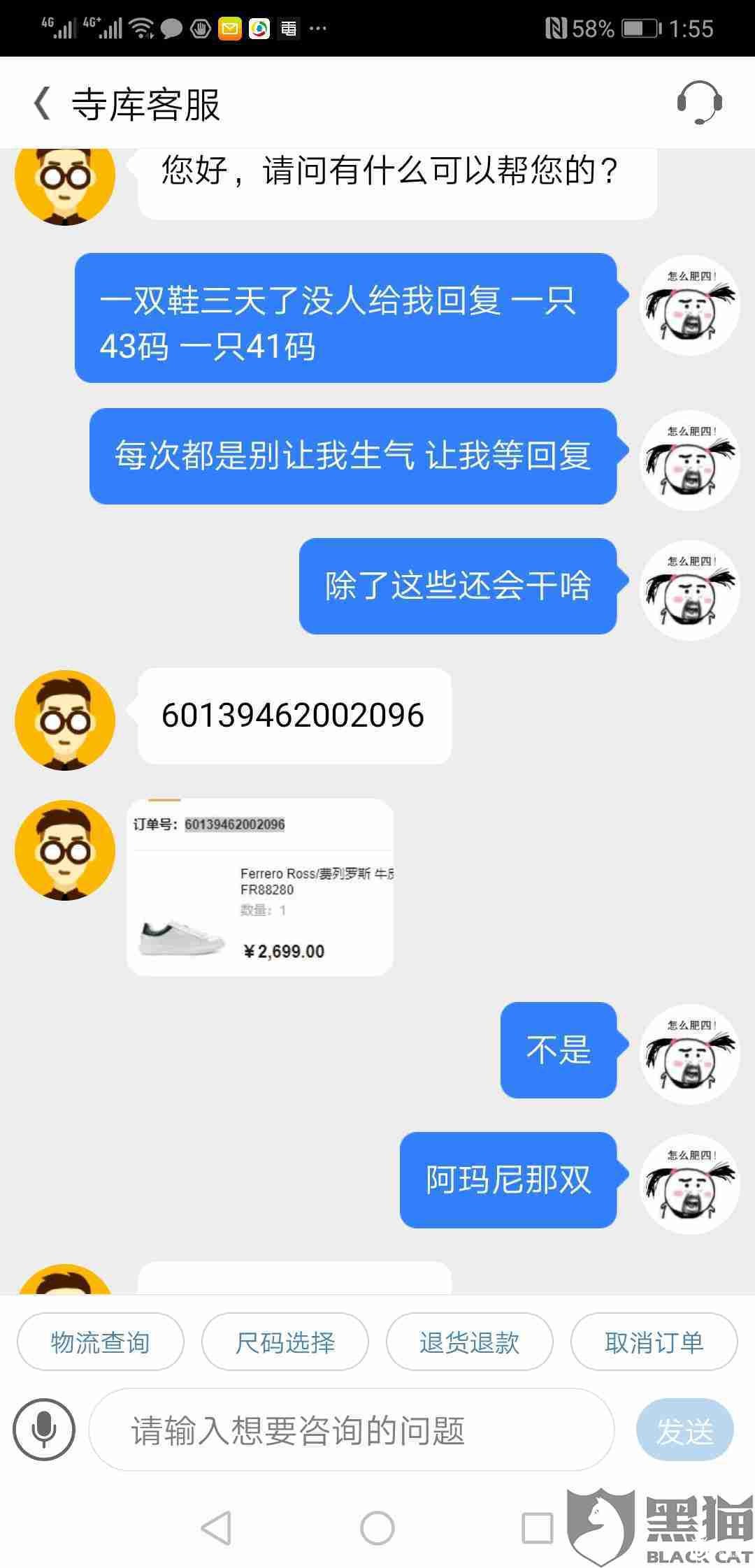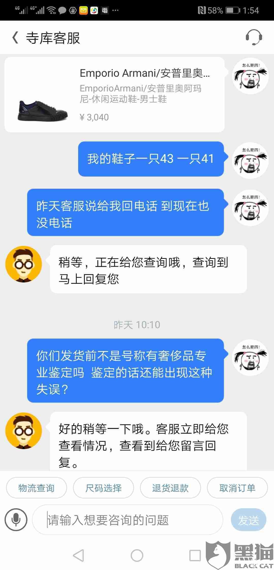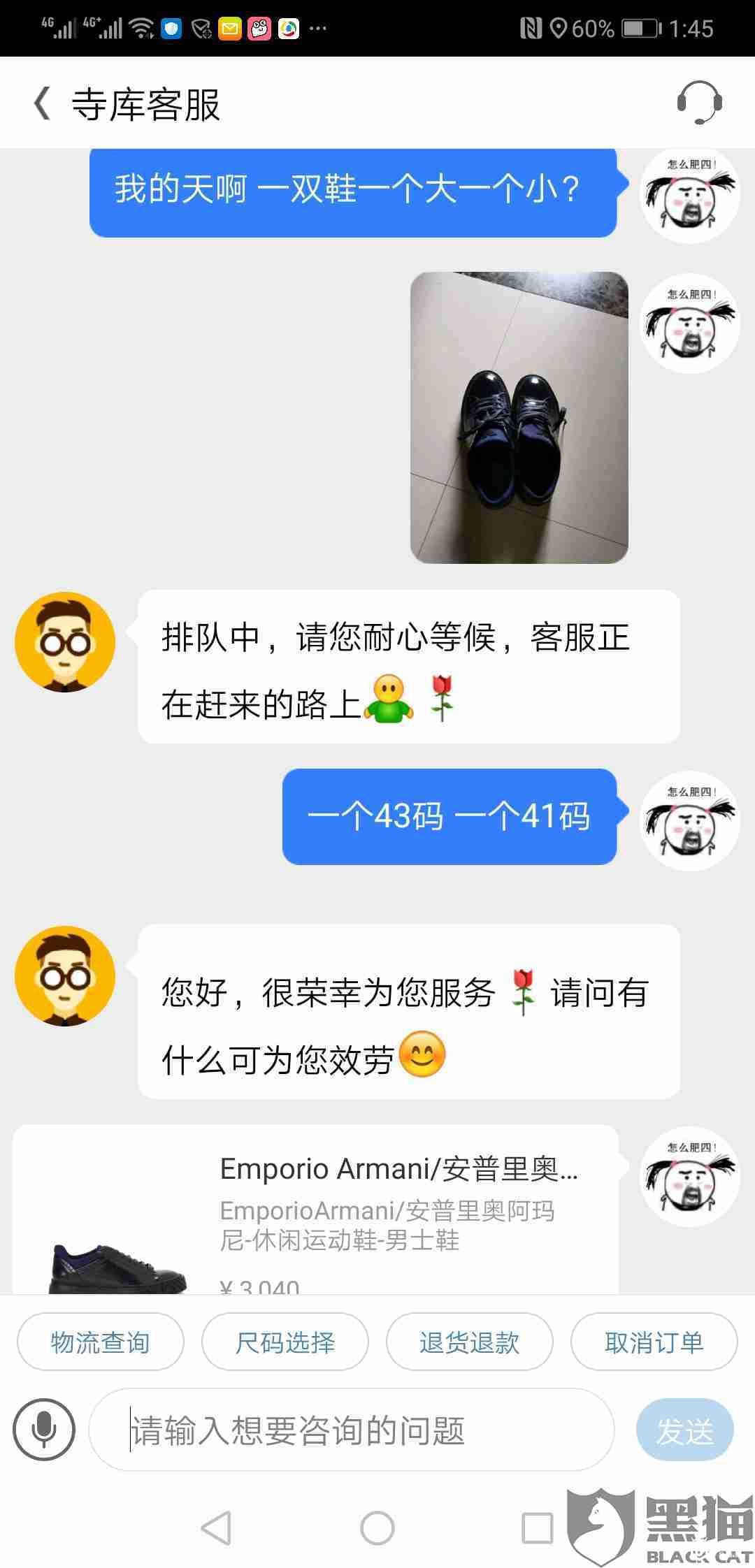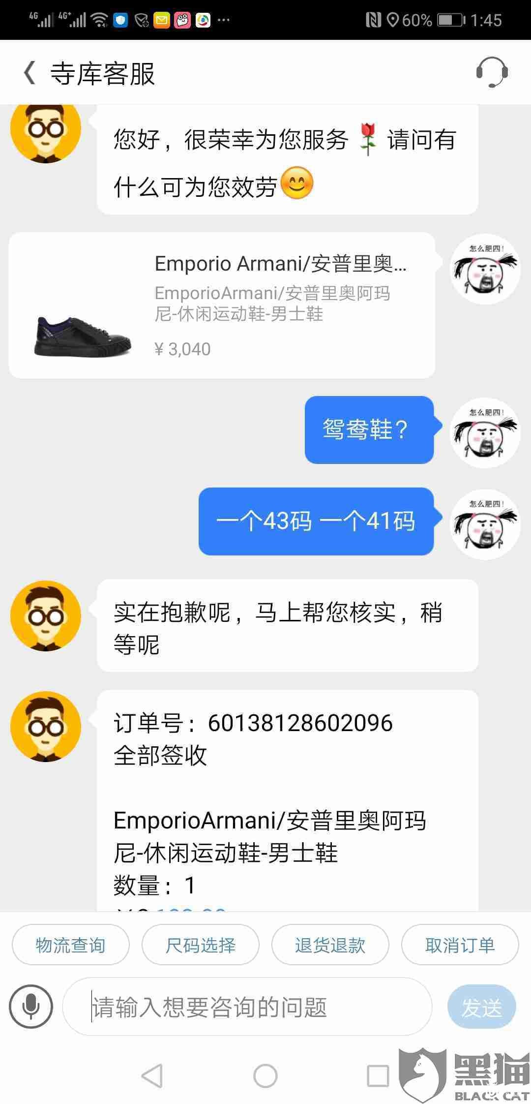 投诉详情:震惊!寺库奢侈品(鉴定)平台发货阿玛尼皮鞋,一只43码,一只41码。