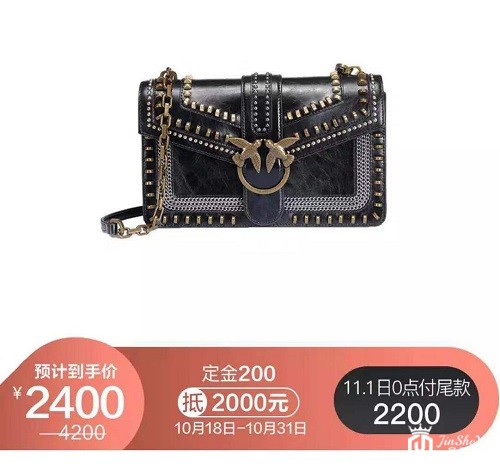 再比如Pinko的这款2019秋冬新品飞鸟包,经典的造型,搭配金属铆钉和银色链条边,这也太酷了吧!定金200抵2000,基本上就是对半了,只想说OMG!