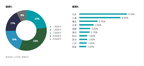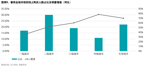 奢侈品城市级别线上购买人数占比及销量增速(同比)(数据来源:公开资料、德勤研究)