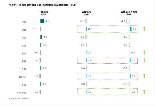 从品类和品牌偏好来看,精致小城青年喜欢护肤,注重保养,对各种护肤类品牌关注度都较高;潮奢小城名媛以品质优先,偏爱中高端服装、奢侈品牌;小城商务精英涉猎品牌范围广,包括中高端服装品牌、手袋品牌及快时尚品牌,是时尚穿搭达人。