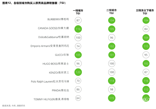 各级别城市购买人群Top10奢侈品品类销售额(TGI)(来源:寺库、德勤研究)
