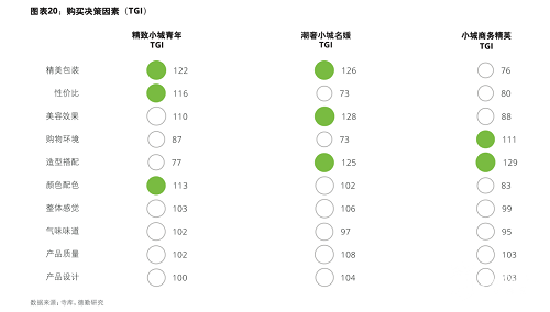 实际上,影响这三类潜在消费者购买决策的因素各不相同。精致小城青年是外貌协会的代表,对产品的包装、颜色最为注重,同时也看重产品性价比;潮奢小城名媛关注整体产品效果,如美容效果、造型搭配等,精美的包装也能刺激他们的购物欲;小城商务精英对整体造型搭配最为关注,同时他们也是最注重购物环境与购物体验的群体。