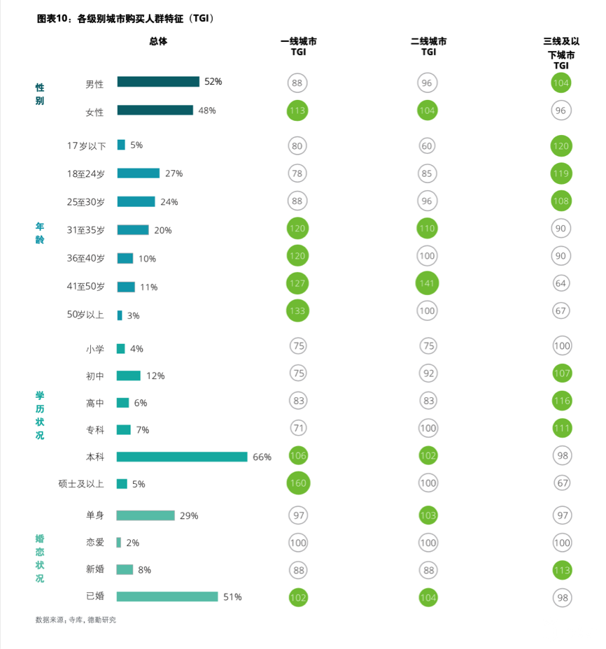 这一现象最根本的原因是消费群体的差异。蓝皮书显示,低线城市的消费者中30岁以下的年轻男性占比较高,学历相对偏低,并且以新婚和恋爱的状态居多;与此相比,一、二线城市网络消费者则以30岁以上的高学历人群为主,已婚人群是主要购买者。由于购买者的差异,产生的消费需求也有着天壤之别。由此产生的市场机会也有很大的不同。