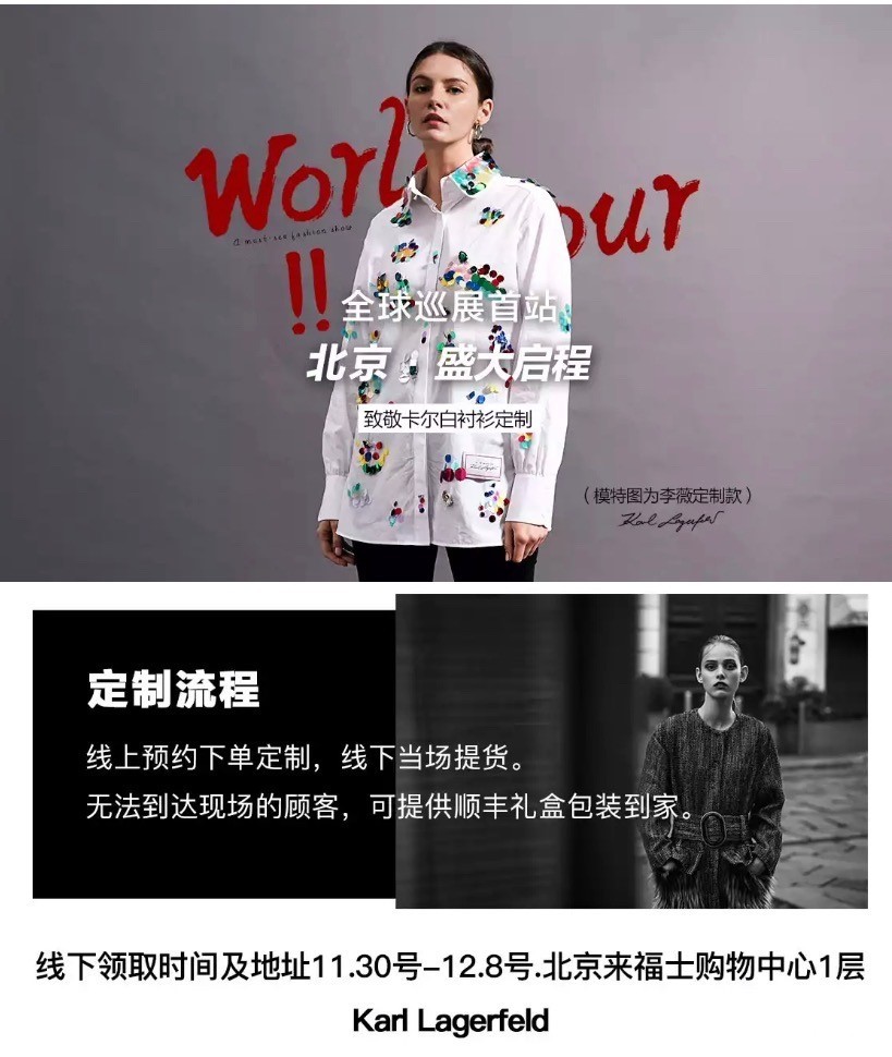 白衬衫定制活动在KARL LAGERFELD欧洲精品店一经推出,便吸引了欧洲消费者的广泛关注与众多媒体报道。在欧洲获得成功后,此次品牌与京东时尚再次联手,将白衬衫定制活动推广至中国,为北京消费者带来奢侈品定制化购买的全新服务模式,消费者可以通过品牌引入的定制打印设备挑选不同的图案和手写字等元素,亲手设计一款带有自己风格和特色的专属“老佛爷”白衬衫。