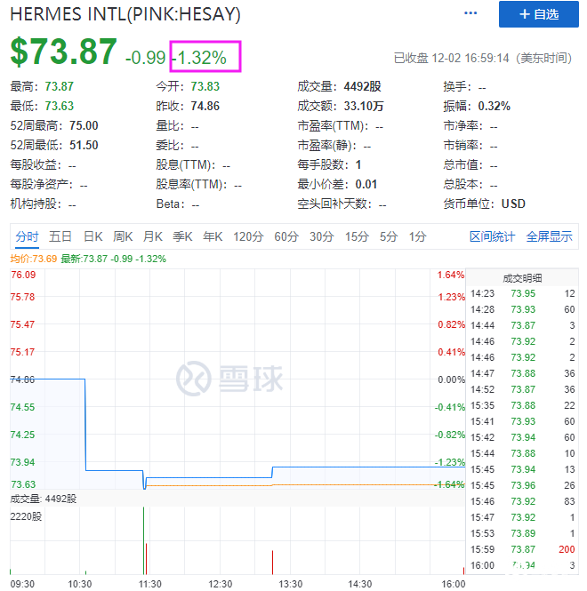 受此消息影响,2日晚间,法国著名奢侈品爱马仕开盘下跌1.32%,全天交投清淡。