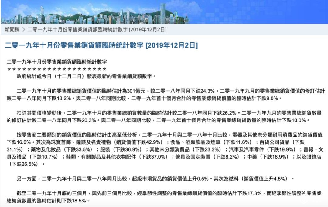 统计处新闻显示,2019年10月的香港零售业总销售额临时估计为301亿港元,同比下跌24.3%。2019年前10个月合计的零售业总销售额临时估计下跌9.0%。