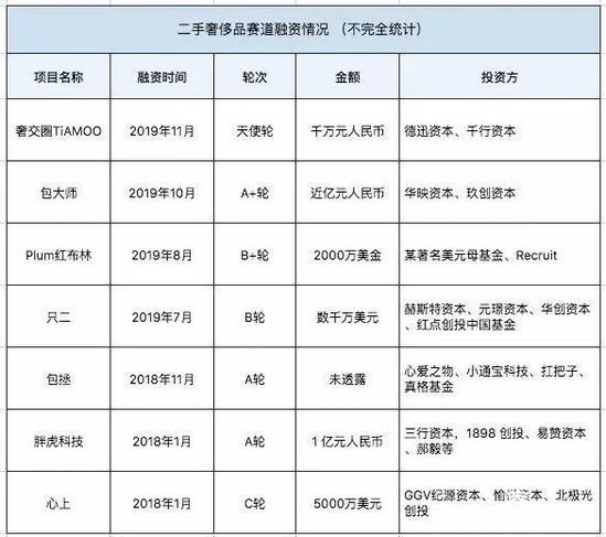 去年11月,轻奢品售后公司包拯获得真格基金等投资机构的支持,同年1月,闲置奢侈品交易服务平台“胖虎科技”正式宣布完成1亿元人民币A轮融资,“心上”完成由GGV纪源资本和愉悦资本共同领投,北极光创投追投的5000万美元C轮融资。