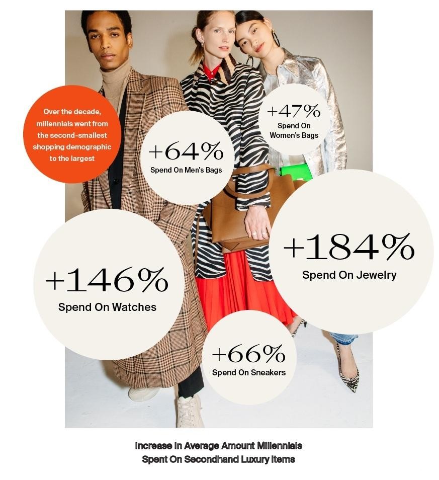 随着年龄增长,千禧一代逐渐成为奢侈品转售行业的主力,他们最钟爱的二手商品为珠宝和腕表,其中在二手珠宝产品上的支出增长了184%,在二手手表产品上的支出增长了146%。