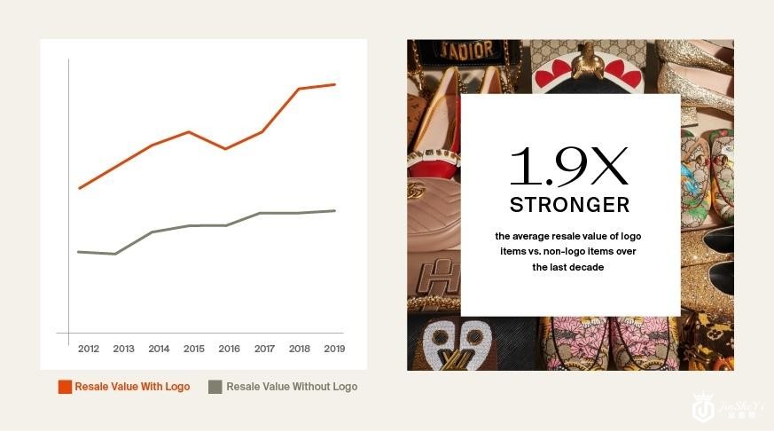 过去十年,Logo仍然是消费者的心头好,带Logo的二手奢侈品平均转售额是不带Logo的1.9倍。根据The RealReal的报告显示,带D字母Logo的Dior斜挎手袋的投资回报率高达108%,而带GG字母Logo的Gucci Marmont肩包的投资回报率为81%。