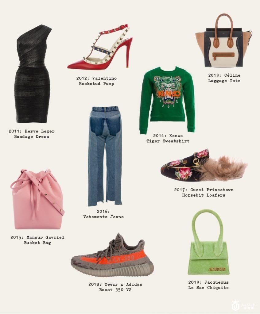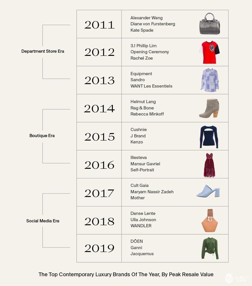 在百货商店时代(2011至2013年),Alexander Wang、Rachel Zoe、Sandro等时尚品牌在转售市场上最受欢迎;而到了精品店时代(2014至2016年),最受欢迎的时尚品牌为Helmut Lang、J Brand、Self-Portrait等;进入社交媒体时代(2017至2019年),Cult Gaia、WANDLER、Jacquemus等时尚品牌则成为转售市场新宠。