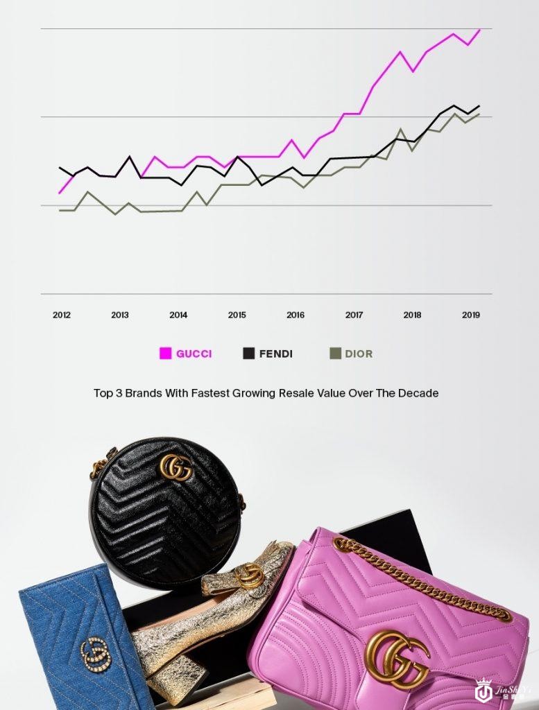过去十年,Gucci(古驰)、Fendi(芬迪)和Dior(迪奥)是转售升值最快的三大品牌,其中尤以Gucci的表现最佳。