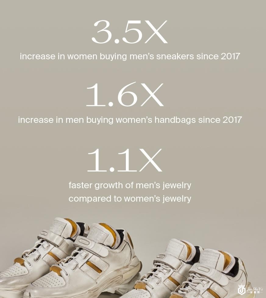 无论是设计师还是意见领袖,还是时尚消费者,性别流动性在21世纪10年代最后几年越来越突出:自2017年,购买男性运动鞋的女性增长了3.5倍;购买女性手袋的男性增长了1.6倍。