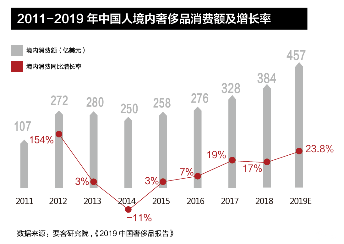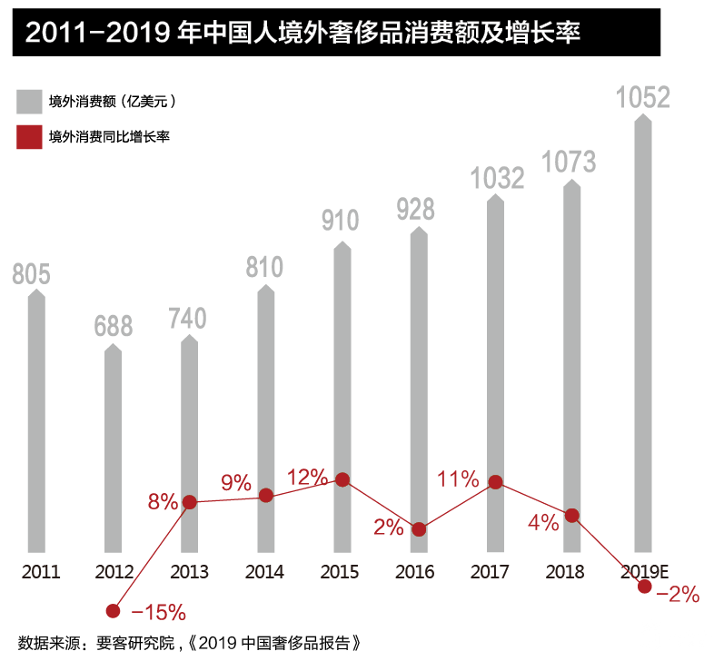 2019年,中国人全球奢侈品消费额达到1527亿美元,增长5%,占全球奢侈品市场的比例由42%下降到40%,这是中国人消费奢侈品全球占比近十年来首次下滑。其中,2019年中国人境外消费奢侈品1052亿美元,增长率为-2%,在海关监管、香港暴乱和跨境电商几个最主要因素影响下,导致了中国人境外奢侈品消费首次出现负增长;但与境外消费下滑形成鲜明对比的是,中国大陆奢侈品消费强势增长,国内奢侈品总消费额增加至475亿美元,增长率高达24%,其中国际新品牌的进入,特别是数量庞大的高端小众或定制品牌的进入,为中国奢侈品市场带来更多新增长点。