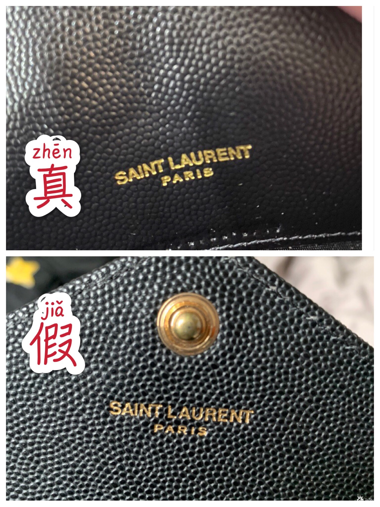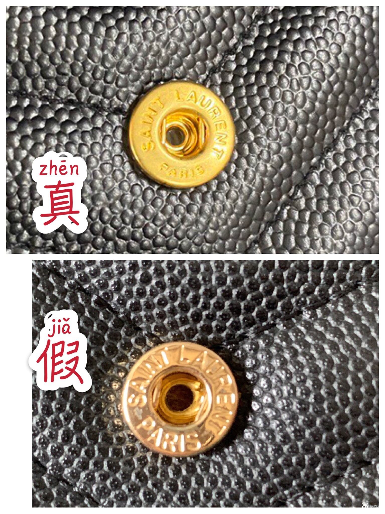 真包的YSL金属扣显得更加厚重,表面更平滑,散发淡淡的光泽优雅,仿品的YSL金属扣银色显得更亮一点,表面似乎有点花,真的是挺难辨别的。