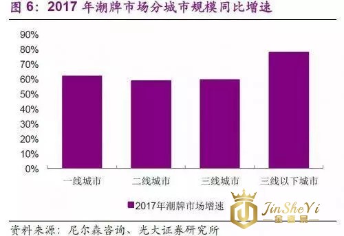 四个一线城市外,国内几十个三线以下城市的年轻人们对潮牌的需求可能是想象不到的旺盛。今年3月尼尔森发布的潮牌市场调研数据显示,二线城市由成都、杭州、重庆领跑,贵阳、呼和浩特、南通为三线城市消费主力,其中青海地区相较去年消费涨幅达385%。