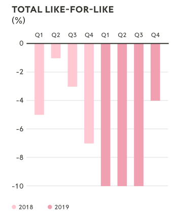 自2018年第一季度起,潘多拉的可比销售额已经连续8个季度下滑,2019年第四季度可比销售额跌幅收窄至下滑4%,但是实现销售增长似乎遥遥无期。潘多拉预计2020年可比销售额将继续下降3%到6%,而该预测甚至还没有计入新冠肺炎疫情对销售额的影响。