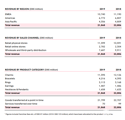 潘多拉珠宝2019年按地区和品类划分详细业绩