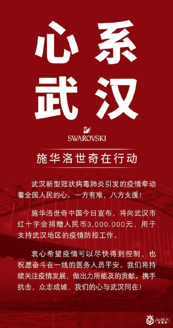 疫情发生后,周大福珠宝集团第一时间向武汉黄陂区慈善会捐赠首批100万元人民币,用于采购医疗物资和防护设备及相关药品等。同时周大福珠宝产业园武汉园区所有租户实施2月份免租金、3月4月份租金减半的优惠,助力武汉抗击疫情。施华洛世奇此次也通过捐款参与助力。早在1月25日便宣布将向武汉红十字会捐款300万元,用于采购医疗物资抗击疫情。
