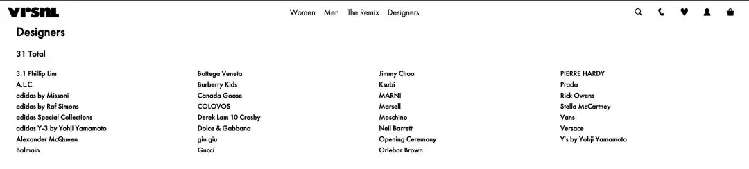 网站主页 通过网站不难看出,VRSNL聚焦于高端设计和街头时尚风格,目前已有30多个品牌入驻,有Prada、Burberry、Rick Owens 等奢侈品牌,也有Vans这类街头潮牌。
