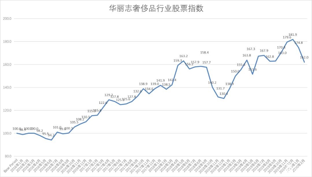 本月,新型冠状病毒疫情对全球奢侈品股票产生的负面影响全面凸显, 华丽志奢侈品指数大幅下跌(174.8——>162.0),一路退回到2019年4月份水平。