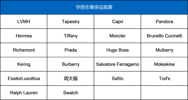 “ 华丽志奢侈品行业股票指数”基于《华丽志》选出的全球22只最具代表性的奢侈品股票(如下图),采用了“市值加权法”——给市值较大的股票以较高权重,给市值较小的股票较低权重。计算的具体方法是把指数中的每只股票的市值(股价×总股本)加起来,先除以基期的总市值,再乘以基期的指数值,基期的指数值设为 100,基期是2016年1月1日。为排除汇率波动的影响,各月均采用基期汇率。