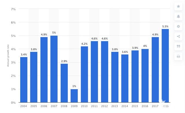 2004-2018全球化妆品增长率