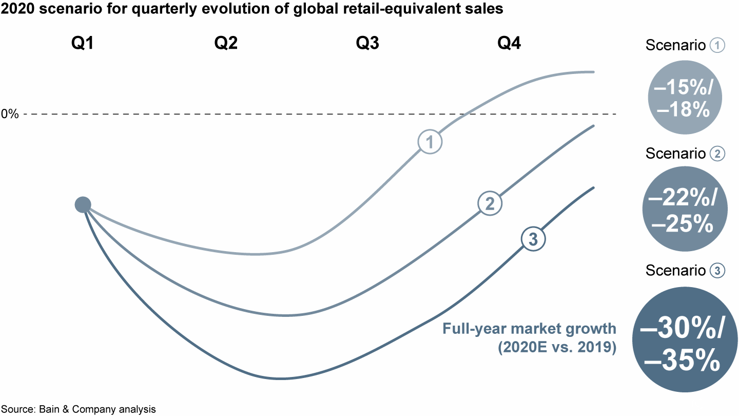 根据疫情潜在的结局、爆发的持续时间和强度,以及全球各主要市场GDP的预期、消费者信心和其他宏观经济指标等因素,贝恩对2020年全球奢侈品市场(相对于2019年)的可能表现给出了三档前景预测: