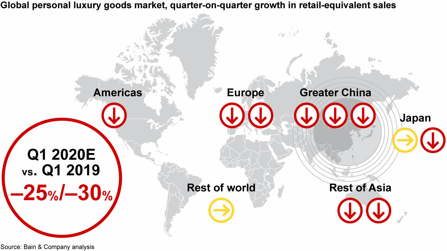 贝恩报告指出,在1月份异常积极的开端之后,2020年第一季度全球市场的表现与新冠病毒的传播密切相关:亚洲销售额大幅下降,而中国处于负面趋势的前列。中国几乎每个奢侈品牌都不得不暂时关闭门店或减少工作时间,造成同比两位数的下滑。值得一提的是,随着复工和门店的重新营业,中国市场的复苏比预期更快。