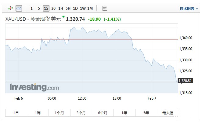 截止北京时间4:36,现货金跌1.4%,报每盎司1,320.74美元,回吐周一0.5%的升幅,盘中现货金一度触及1月18日来最低的1,325.61美元。