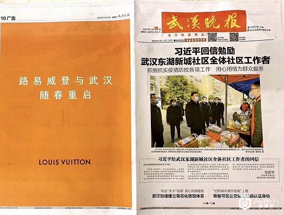 而在疫情中心的武汉,奢侈品消费也在逐渐恢复。3月30日,武汉的多家购物中心正式重新开门迎客,其中位于武汉国际购物中心的Prada、Burberry门店也再度开店。在4月10号,法国奢侈品牌Louis Vuitton更是买下《武汉晚报》整版广告位,来宣告品牌位于武汉的全部门店正式复工。